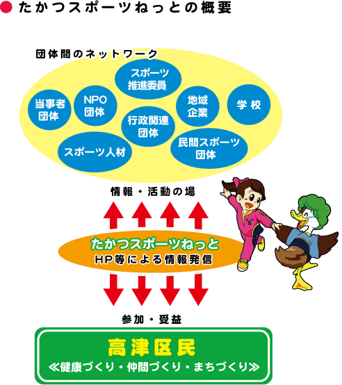 区内のスポーツ情報の集約及び団体間のネットワークをつくることにより一元的な情報発信による市民参加の拡大と、団体間の連携による地域活性化を行うことを目的としています。